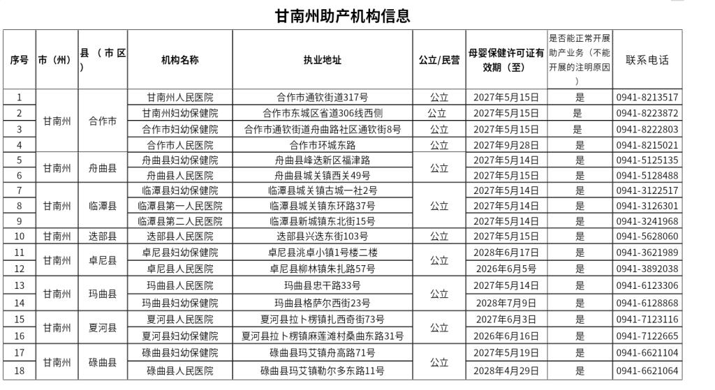 根据国家卫生健康委办公厅《关于进一步加强母婴保健专项技术服务管理的通知》(国卫办妇幼发【2021】20号)要求,现将甘南州助产机构名单和执业地址公示如下,以便主动接受社会监督,方便群众就医。