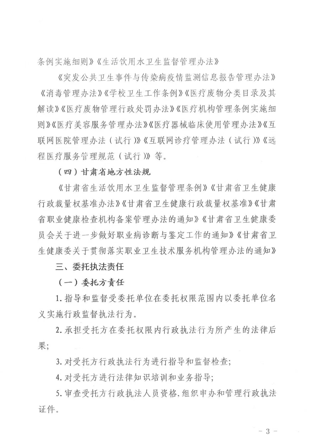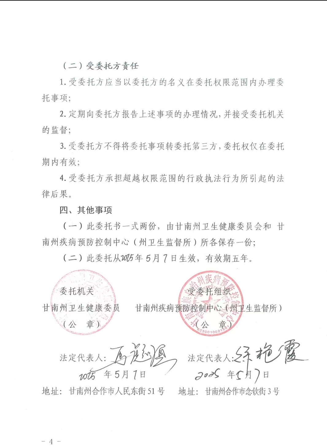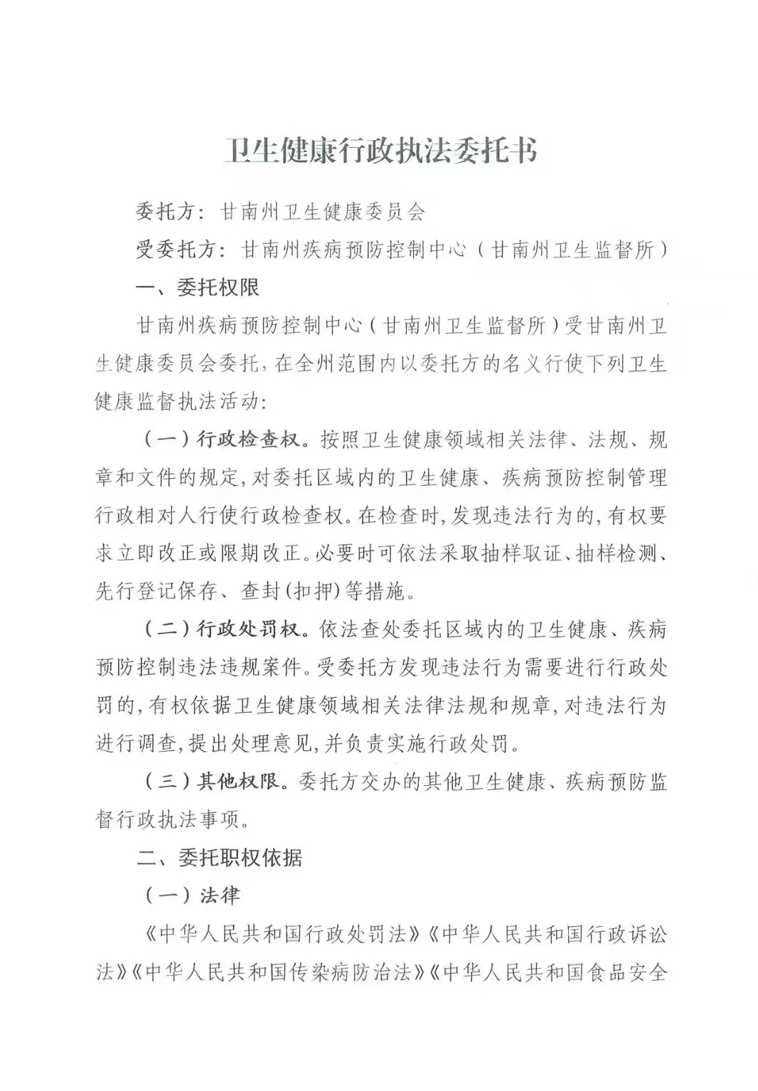 为进一步规范卫生健康行政执法工作,依法确立行政执法委托单位与受委托单位的权利和义务,根据《中华人民共和国行政处罚法》《中华人民共和国基本医疗卫生与健康促进法》《甘肃省行政执法监督条例》《中华人民共和国职业病防治法》《中共甘南州委办公室甘南州人民政府办公室关于印发甘南藏族自治州疾病预防控制中心职能配置、内设机构和人员编制规定的通知》等规定,甘南州卫生健康委员会委托甘南州疾病预防控制中心(州卫生监督所)依法行使有关卫生健康行政监督执法权,并签订了《甘南州卫生健康行政执法委托书》,现予以公示。